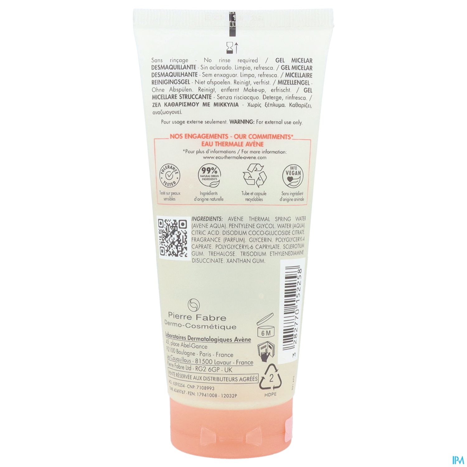 AVENE THERMAL SPRING WATER (AVENE AQUA). PENTYLENE GLYCOL. WATER (AQUA). CITRIC ACID. DISODIUM COCO GLUCOSIDE CITRATE. FRAGRANCE. GLYCERIN. POLYGLYCERYL-4 CAPRATE. POLYGLYCERYL-6 CAPRYLATE. SCLEROTIUM GUM. TREHALOSE. TRISODIUM ETHYLENEDIAMINE DISUCCINATE. XANTHAM GUM.